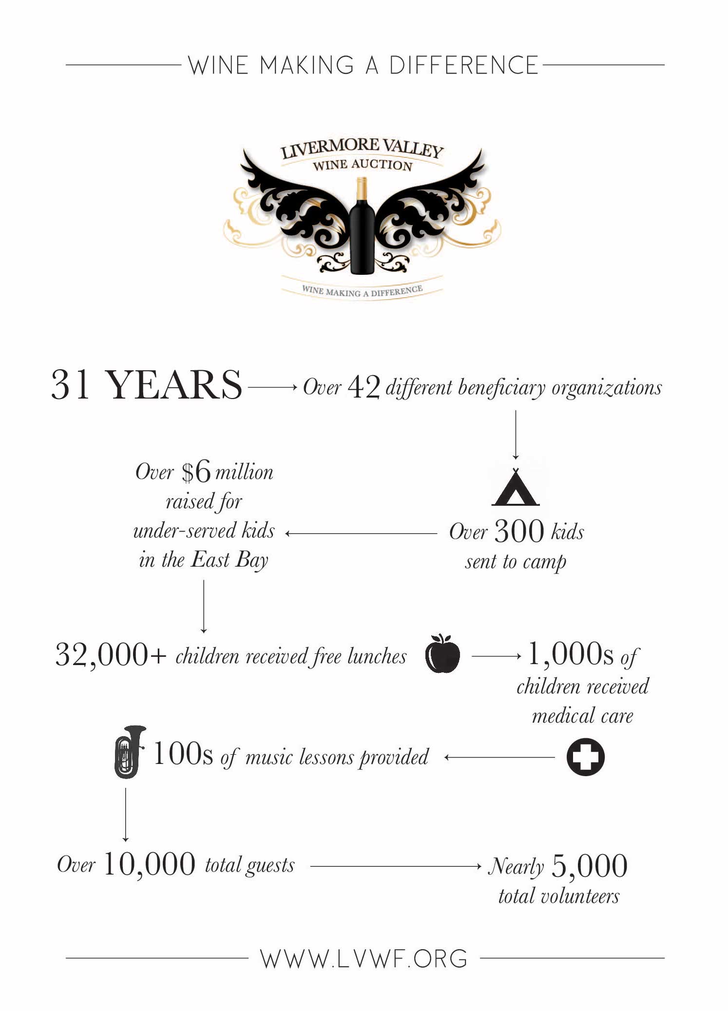 Our mission is to improve the quality of life for underserved local children and Individuals with intellectual and developmental disabilities by raising funds for organizations that meet basic needs and provide access to education and enrichment. The Board of the Livermore Valley Winegrowers Foundation works all year to plan the Livermore Valley Wine Auction. Since 1995, the Auction has raised over $5 million for worthwhile local organizations.